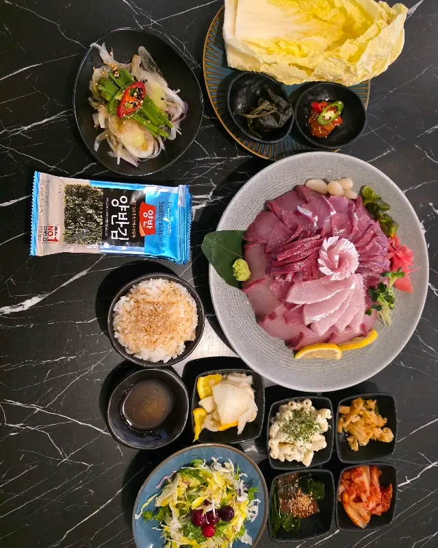 김에 밥을 올리고, 방어회 한 점, 백김치, 쌈장 살짝 올려서 싸 먹으니… 환상의 조합! 김의 고소함, 밥의 달콤함, 방어회의 고소함, 백김치의 시원함이 한데 어우러져 입안에서 축제가 벌어지는 듯했다. 쉴 새 없이 젓가락을 움직였다. 정말 순식간에 방어회 한 접시를 해치웠다.