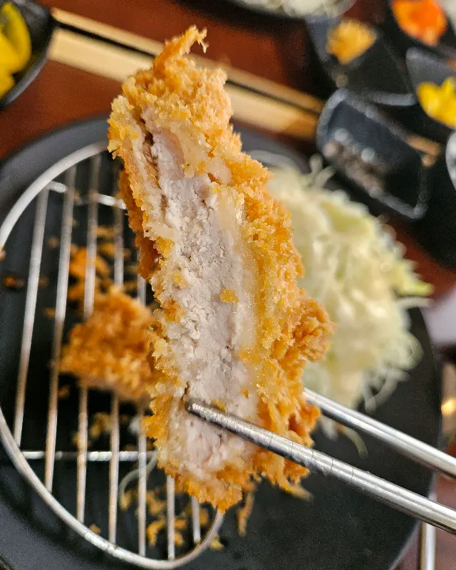 두툼한 고기와 바삭한 튀김옷이 인상적인 돈까스 단면