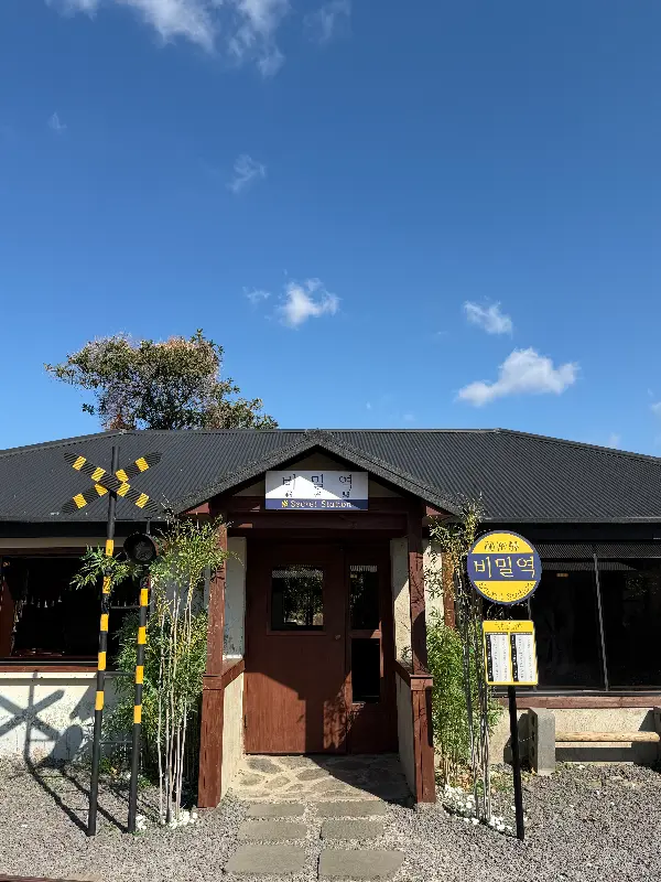 네비게이션의 안내를 따라 좁은 골목길을 따라 들어가니, 과연 그 이름처럼 비밀스러운 공간이 모습을 드러냈다. 주변은 한적한 시골 마을의 풍경이었지만, 비밀역 입구에 들어서는 순간, 나는 완전히 다른 세상에 발을 들인 듯한 느낌을 받았다. 낡은 철길이 카페로 향하는 길을 안내하고, 기차역에서 흔히 볼 수 있는 건널목 표지판이 세워져 있었다. 마치 영화 속 한 장면처럼, 비현실적인 풍경이 눈앞에 펼쳐졌다.