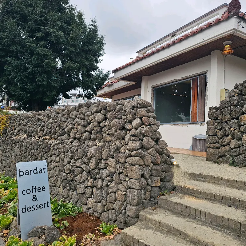 돌담길을 따라 걷다 보니, 저 멀리 아담한 건물이 눈에 들어왔어. 낡은 돌담과 푸른 나무들이 어우러진 모습이, 마치Secret Garden에 들어서는 기분이랄까? 카페 입구에는 작은 간판이 세워져 있었는데, “pardar coffee & dessert”라고 적힌 글씨가 어찌나 앙증맞던지. 벌써부터 사진 찍을 생각에 가슴이 두근거렸지.
