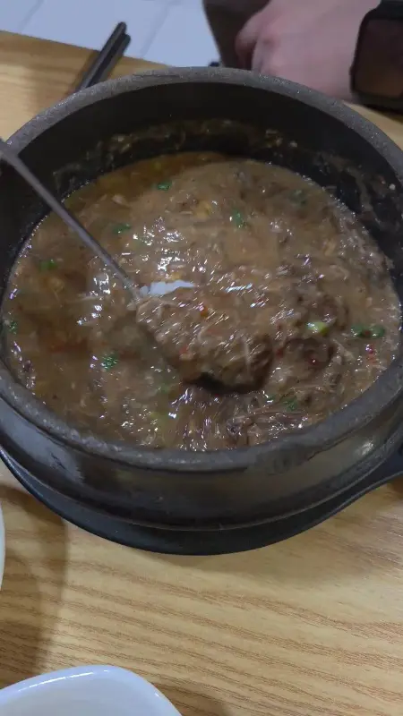 드디어 내 차례가 되어 식당 안으로 들어섰다. 자리에 앉자마자, 기다렸던 메뉴들이 하나둘씩 나오기 시작했다. 가장 먼저 눈에 들어온 것은 역시 고사리 해장국이었다. 뚝배기 안에는 잘게 찢은 고사리와 고기가 가득 담겨 있었고, 그 위에는 신선한 파와 고춧가루, 깨가 듬뿍 뿌려져 있었다. 첫인상은 마치 걸쭉한 추어탕과도 같았다. 국물을 한 숟가락 떠서 입에 넣는 순간, 입안 가득 퍼지는 깊고 구수한 풍미에 감탄을 금할 수 없었다.