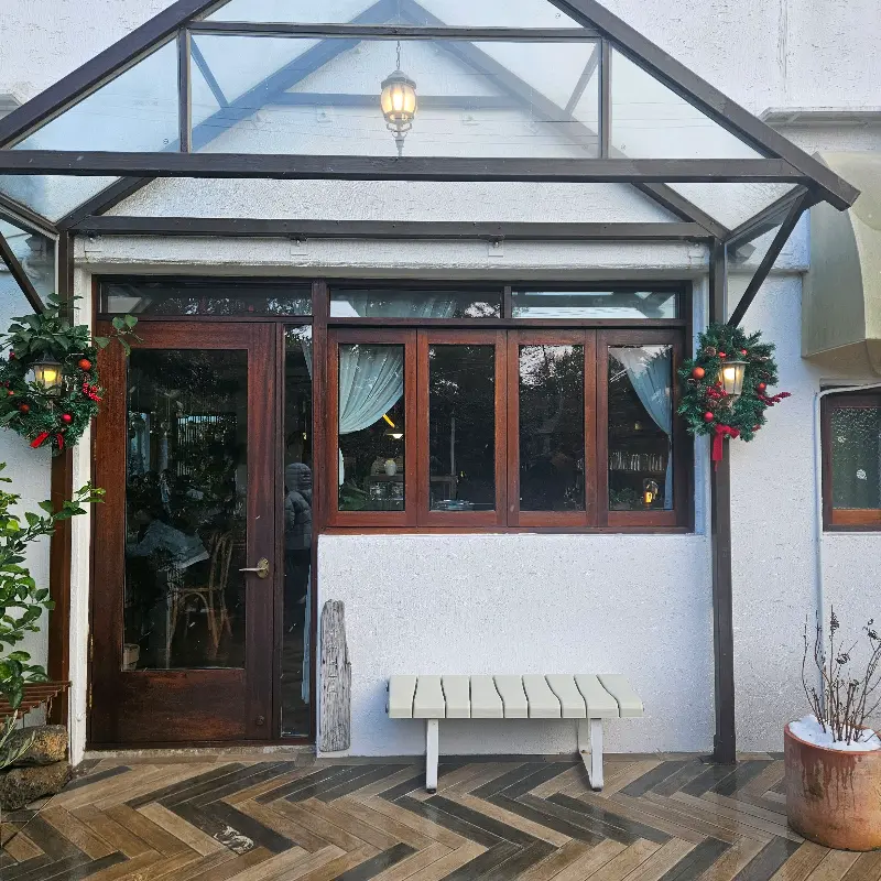 카페 문을 열자마자 따뜻한 기운이 확 느껴졌어. 문 앞에는 귀여운 크리스마스 리스가 걸려있고, 은은한 조명이 아늑함을 더했지. 나무로 된 바닥은 걷을 때마다 기분 좋은 소리를 냈어.