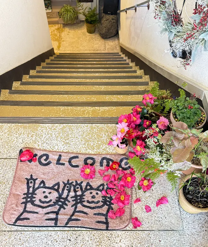 카페로 향하는 계단 입구부터 놓인 웰컴 매트에는 고양이 그림과 함께 붉은 동백꽃이 장식되어 있었다. 마치 비밀 정원으로 들어가는 듯한 기대감이 샘솟았다. 문을 열고 들어서자, 은은한 꽃향기가 코끝을 간지럽혔다. “잘 찾아왔다”는 속삭임이 들리는 듯했다.