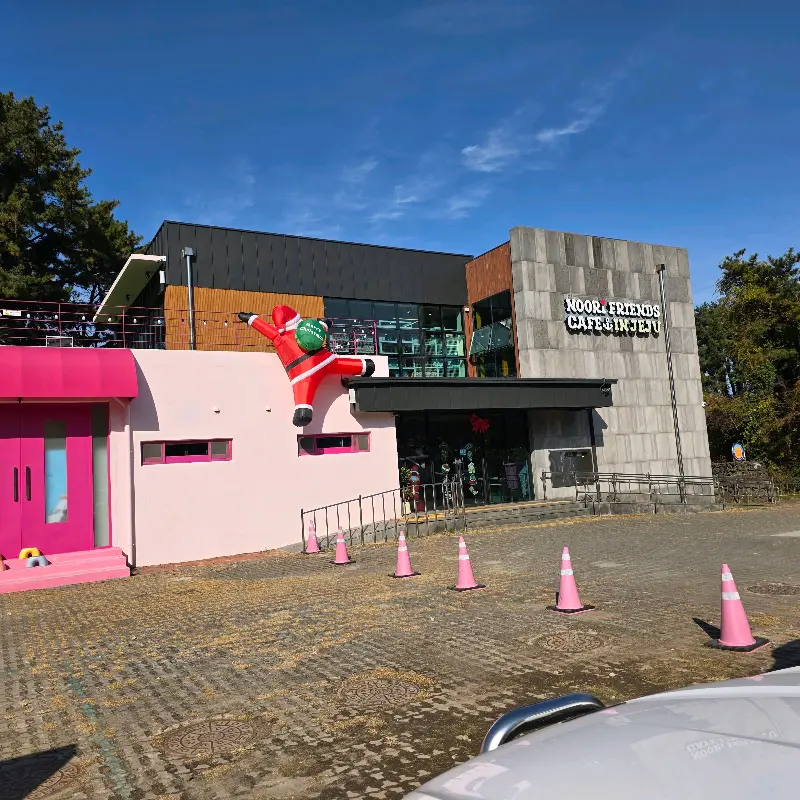 카페 외관부터가 심상치 않았어. 멀리서도 눈에 띄는 핑크색 건물에 거대한 산타클로스 조형물이 떡 하니 붙어있는데, 누가 봐도 “나, 특별한 곳이야!” 라고 외치는 듯했지. 주차장도 넓어서 편하게 주차할 수 있었어. 차에서 내리자마자 사진부터 찍기 시작했는데, 핑크색 문 앞에서 찍는 사진이 그렇게 예쁘게 나오더라고.