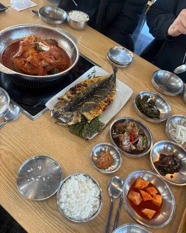 드디어, 고등어 쌈밥이 모습을 드러냈다. 냄비 안에서 보글보글 끓는 김치찜의 비주얼은 시각적으로도 강렬한 인상을 주었다. 김치의 붉은 색감과 고등어의 윤기가 어우러져, 침샘을 자극하는 것은 당연지사. 160도에서 마이야르 반응이 일어난 듯, 고기 표면에 얇게 형성된 갈색 크러스트는 시각적인 풍미를 더했다. 김치는 적절한 숙성 과정을 거친 듯, 깊고 풍부한 향을 뿜어냈다.