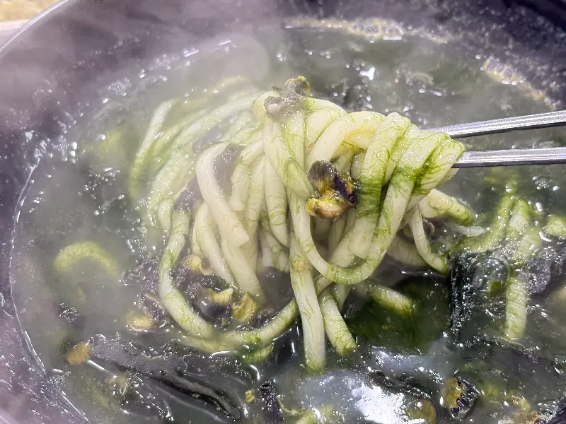 보말칼국수의 핵심은 역시 보말이었다. 보말은 다른 해산물에 비해 글리신과 알라닌 함량이 높아 특유의 단맛을 낸다. 이 단맛이 국물의 감칠맛과 어우러져 복합적인 풍미를 만들어내는 것이다. 또한 보말에는 아미노산의 일종인 타우린이 풍부하게 함유되어 있는데, 타우린은 피로 해소와 간 기능 개선에 도움을 준다고 알려져 있다. 즉, 보말칼국수는 맛과 건강을 동시에 잡을 수 있는 훌륭한 음식인 셈이다. 는 젓가락으로 들어올린 면발을 아주 가까이에서 촬영한 사진인데, 면에 촘촘히 박힌 보말 알갱이들이 얼마나 많이 들어갔는지 짐작하게 한다.
