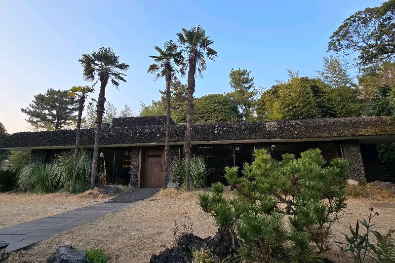 네비게이션이 안내한 곳은 웅장한 돌담으로 둘러싸인, 마치 비밀 정원 같은 공간이었다. 입구에 들어서자마자 펼쳐지는 풍경은 탄성을 자아내게 했다. 야자수 나무와 귤밭이 어우러진 이국적인 정원은, 흡사 잘 꾸며진 영화 세트장 같았다. 건물 외관은 콘크리트와 현무암의 조화로 이루어져 있었는데, 자연과의 조화를 꾀한 듯 주변 풍경과 완벽하게 어우러졌다. 을 보면, 건물의 질감과 주변 식생의 조화가 얼마나 뛰어난지 한눈에 알 수 있다. 마치 건축가가 오랜 시간 공들여 완성한 예술 작품 같았다.