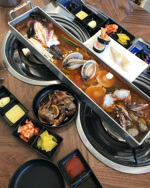메뉴판을 펼쳐 보니, 해물라면과 칼국수 외에도 다양한 해산물 요리들이 눈에 띄었다. 고민 끝에, 3인 세트 메뉴를 주문했다. 세트 메뉴에는 해물라면 또는 칼국수, 튀김, 그리고 초밥이 포함되어 있었다. 우리는 칼국수로 선택했는데, 면을 씹는 맛을 제대로 즐기고 싶었기 때문이다. 잠시 후, 기다란 사각 철판 냄비에 푸짐하게 담긴 해물칼국수가 테이블 위에 놓였다.