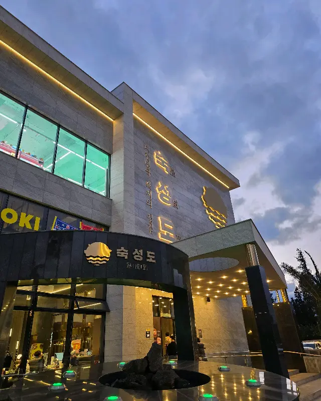 제주 여행을 계획하면서 가장 기대했던 순간 중 하나는 단연 흑돼지 맛집 탐방이었다. 수많은 맛집 리스트 중에서 고심 끝에 선택한 곳은 바로 ‘숙성도 중문점’. 워낙 명성이 자자한 곳이라 긴 웨이팅을 각오하고 방문했지만, 넓고 쾌적한 공간 덕분인지 생각보다 빠르게 자리를 안내받을 수 있었다. 현대적인 감각이 돋보이는 외관과 깔끔한 실내 인테리어는 기대감을 한층 더 고조시켰다. 건물 외관에는 은은한 조명이 더해져 고급스러운 분위기를 자아냈다.