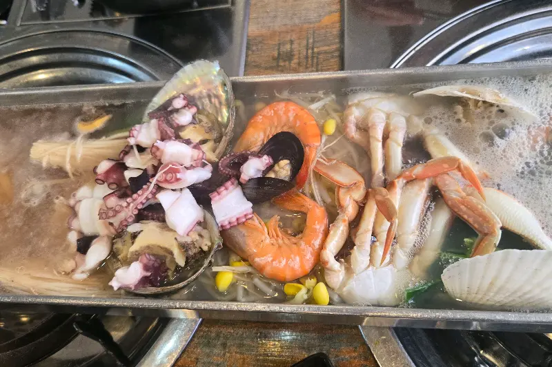 메뉴판을 펼쳐 들고 한참을 고민했다. 해물라면도 먹고 싶고, 칼국수도 포기할 수 없었기 때문이다. 결국 우리는 3인 세트를 주문하기로 결정했다. 칼국수와 튀김, 전복 버터구이까지 맛볼 수 있는 알찬 구성이었다. 잠시 후, 기다리고 기다리던 음식이 나왔다. 길쭉한 사각형 모양의 독특한 그릇에 푸짐하게 담긴 해산물은 그야말로 장관이었다. 큼지막한 문어, 전복, 가리비, 새우, 꽃게 등 싱싱한 해산물이 가득했고, 그 아래에는 쫄깃한 생면 칼국수가 숨어 있었다. 사진으로만 보던 비주얼을 실제로 보니 감탄사가 절로 나왔다.