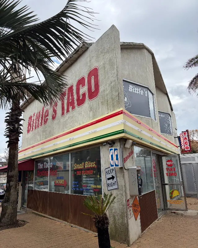 가게 외관부터가 예사롭지 않았다. 낡은 듯하면서도 개성 넘치는 건물의 외벽에는 큼지막한 붉은 글씨로 ‘Bittle’s TACO’라고 쓰여 있었다. 마치 오래된 팝 아트 작품처럼, 묘하게 촌스러운 듯하면서도 시선을 사로잡는 매력이 있었다. 야자수 그림이 그려진 간판과 빈티지한 전화 부스, 그리고 ‘KEEP RIGHT’ 표지판까지, 모든 요소가 이국적인 분위기를 자아냈다. 사진 속에서 보았던 모습 그대로, 아니, 그 이상으로 힙한 공간이었다.