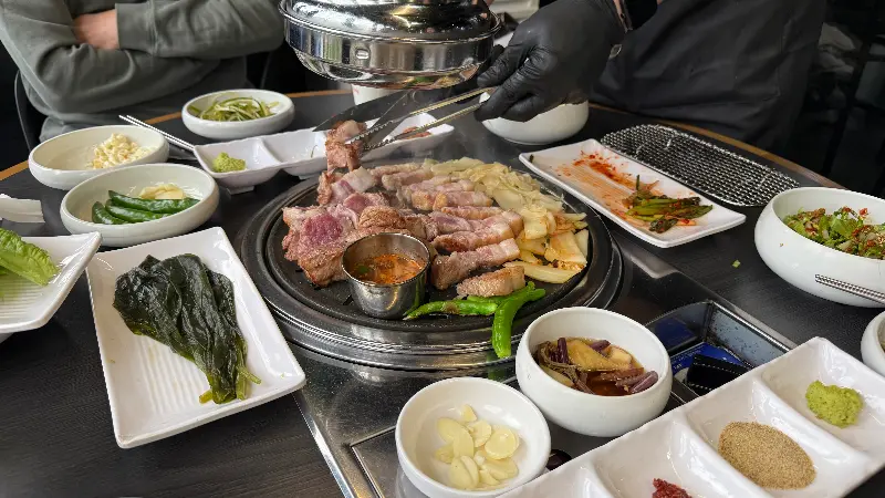 드디어 기다리고 기다리던 흑돼지가 등장했다. 볏짚으로 초벌되어 은은한 훈연 향을 머금은 흑돼지의 자태는 정말 먹음직스러웠다. 직원분들은 능숙한 솜씨로 고기를 굽기 시작했다. 숯불 위에서 지글거리는 소리와 함께 퍼져나가는 고소한 냄새는 식욕을 더욱 자극했다. 겉은 바삭하고 속은 촉촉하게 익어가는 흑돼지를 바라보는 것만으로도 행복감이 밀려왔다.