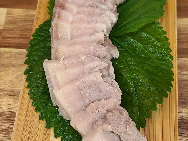 드디어 기다리고 기다리던 돔베고기 등장! 야들야들한 돔베고기가 윤기 좔좔 흐르는 게 진짜 비주얼 미쳤다… 갓 삶아져 나온 듯한 따끈함이 느껴지는 게, 젓가락을 멈출 수 없게 만드는 비주얼이야. 특히 돔베고기 밑에 깔린 깻잎이 신의 한 수! 돔베고기 한 점 딱 집어서 깻잎에 싸 먹으니까 향긋한 깻잎 향이랑 쫄깃한 돔베고기가 입안에서 완전 파티를 열어버리네.