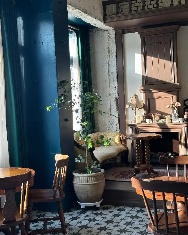 카페는 1층과 2층으로 나뉘어져 있는데, 1층은 빈티지한 가구와 소품들로 꾸며져 있어 마치 유럽의 고풍스러운 응접실에 들어온 듯한 느낌을 줍니다. 어두운 나무색 가구와 은은한 조명이 자아내는 따뜻한 분위기는, 바깥의 차가운 바람을 잊게 할 만큼 아늑합니다. 앤티크한 샹들리에와 벽난로, 그리고 오래된 책들이 놓여진 책장은, 빈투지만의 독특한 개성을 드러내는 요소들이죠.