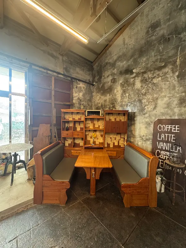 주문을 마치고 카페 내부를 둘러보았다. 은 카페 내부의 한쪽 벽면을 담고 있는데, 나무로 짜인 테이블과 의자가 정갈하게 놓여 있었다. 벽에는 메뉴판으로 보이는 칠판이 걸려 있고, 은은한 조명이 따뜻한 분위기를 더했다. 한쪽에는 만화책이 가득 꽂힌 책장이 놓여 있었는데, 아이와 함께 온 가족 단위 손님들을 위한 배려가 느껴졌다. 실제로 카페에는 아이와 함께 온 가족들이 만화책을 읽으며 즐거운 시간을 보내고 있었다. 에서 보이는 책장 옆 벽면에는 방문객들이 남긴 쪽지들이 빼곡하게 붙어 있었는데, 저마다의 추억과 감성이 고스란히 담겨 있는 듯했다.
