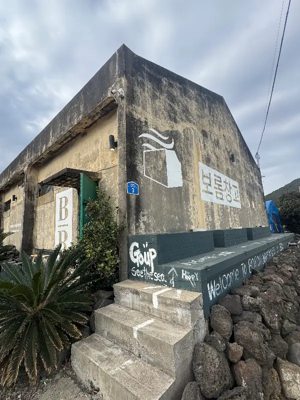 카페에 도착하자, 낡은 창고 건물이 눈에 들어왔다. 겉모습은 투박하지만, 묘하게 끌리는 분위기가 있었다. 콘크리트 벽에는 세월의 흔적이 고스란히 남아 있었고, 군데군데 이끼가 낀 모습마저 멋스러웠다. 입구에는 “Welcome to Boromchanggo”라는 문구가 손글씨로 쓰여 있었다.