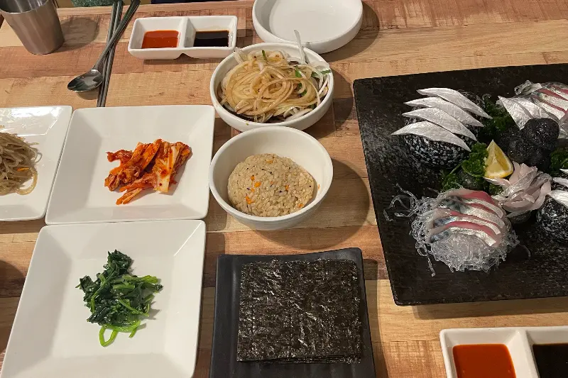 회를 김에 싸서 밥과 함께 먹으니, 그 맛이 더욱 환상적이었다. 짭짤한 김과 밥, 그리고 신선한 회의 조화는 그야말로 꿀맛이었다. 곁들여 나온 쌈장도 회의 풍미를 더욱 깊게 만들어 주었다.