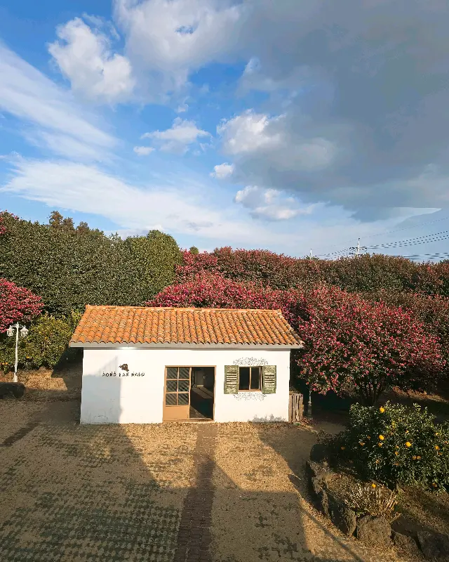 네비게이션이 안내하는 좁은 골목길을 따라 들어가니, 마치 숨겨진 연구실처럼 아담한 건물이 눈에 들어왔다. 귤밭 너머로 보이는 하얀 외벽과 붉은 기와지붕의 조화는, 그 자체로 훌륭한 피사체였다. 건물 외벽에는 섬세한 동백꽃 그림이 그려져 있었는데, 마치 세포의 움직임을 형상화한 듯 생동감이 넘쳤다. 예상대로, 이곳은 시각적인 자극을 통해 도파민 분비를 활성화시키는 데 최적화된 공간임이 분명했다.