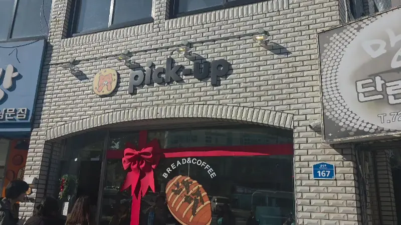 멀리서도 눈에 띄는 픽업카페 외관! 빵 모양 간판이 너무 귀여워.