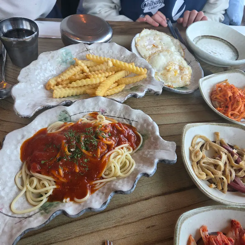 함께 제공된 성게 미역국은 시원하고 깊은 맛이 일품이었다. 특히 아침 11시 30분 전에 방문하면 서비스로 제공된다고 하니, 시간을 맞춰 방문하는 것을 추천한다. 미역국에 밥을 말아 김치를 곁들여 먹으니, 그 조화가 환상적이었다. 아이들은 서비스로 제공된 감자튀김과 스파게티를 맛있게 먹었다. 특히 스파게티는 어릴 적 먹던 추억의 맛 그대로였다.