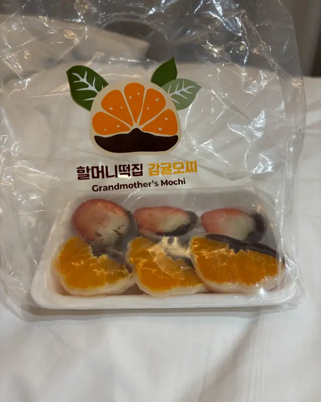 드디어 손에 넣은 모찌, 따스한 햇살 아래 그 모습을 다시 한번 감상했다. 투명한 포장지 너머로 보이는 귤의 선명한 주황색과 딸기의 탐스러운 붉은색이 어우러져 시각적인 황홀경을 선사했다. 마치 제주의 자연을 그대로 담아 놓은 듯한 모습이었다.