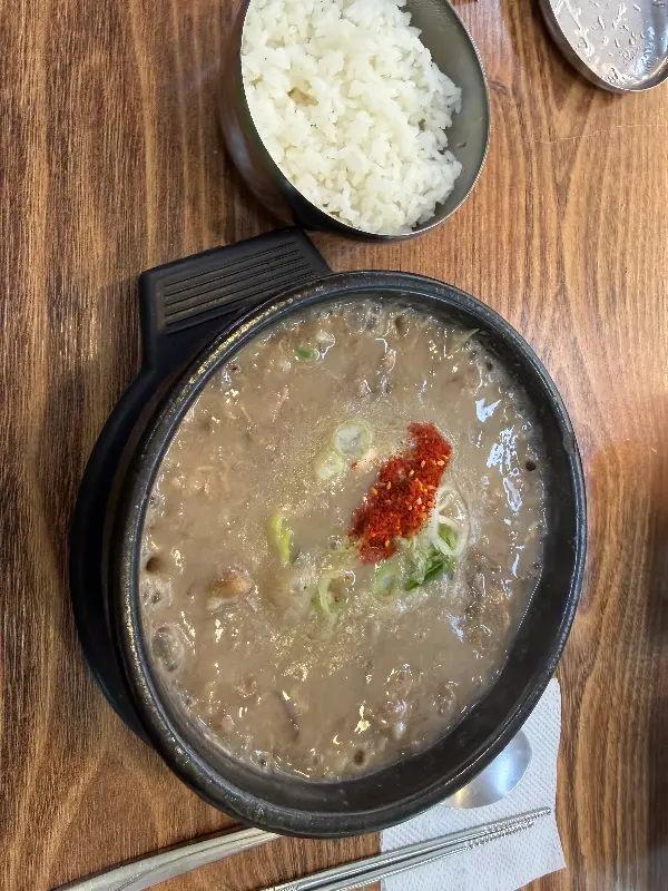 잠시 후, 기다리고 기다리던 고사리해장국이 모습을 드러냈습니다. 뚝배기 안에서 보글보글 끓고 있는 모습은, 보기만 해도 군침이 돌았습니다. 뽀얀 국물 위로 송송 썰린 파와 고춧가루가 얹어져 있어, 시각적인 풍미를 더했습니다. 숟가락으로 국물을 한 입 떠먹으니, 입안 가득 퍼지는 고사리 향이 정말 인상적이었습니다. 부드럽게 씹히는 고사리의 식감 또한 훌륭했고, 깊고 진한 국물은 속을 따뜻하게 감싸주었습니다. 마치 걸쭉한 메밀죽을 먹는 듯한 느낌도 들었지만, 전혀 느끼하지 않고 오히려 고소했습니다.