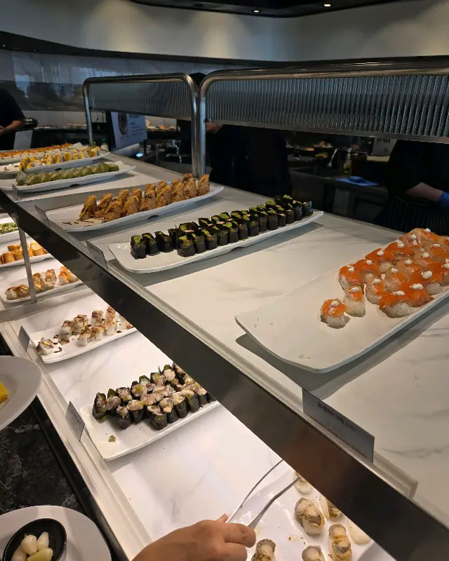 뷔페의 기본은 뭐다? 바로 초밥! 종류별로 쫙 깔린 초밥 코너, 비주얼부터 합격이야. 롤 위에 토핑이 살짝 아쉬운 건 옥에 티. 그래도 밥알이 살아있는 신선한 초밥, 이 정도면 훌륭해. 간장 콕 찍어 입에 넣는 순간, 멈출 수 없는 맛!