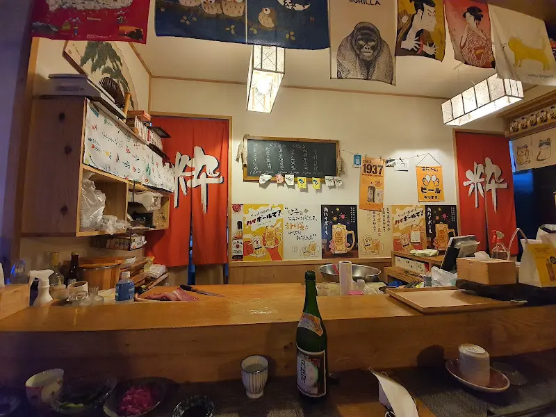 문을 열자마자 훈훈한 기운이 감싸는 게, 마치 오랜 친구 집에 놀러 온 듯한 편안함. 나무로 된 카운터 테이블이 길게 뻗어 있고, 벽에는 일본풍 포스터와 아기자기한 소품들이 눈길을 사로잡네. 천장에는 독특한 디자인의 조명이 은은하게 빛나고, 나무 격자 천장이 아늑함을 더해주는 공간. 혼술하기 딱 좋은 분위기, 완전 내 스타일이야.