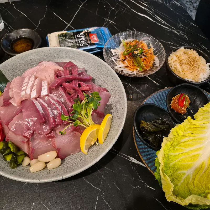 가장 먼저 등장한 것은 대방어회였다. 윤기가 자르르 흐르는 붉은 빛깔의 방어회는 그 신선함이 눈으로도 느껴질 정도였다. 두툼하게 썰린 방어 한 점을 입에 넣으니, 입안 가득 퍼지는 고소함과 쫄깃한 식감이 황홀경을 선사했다. 특히 모루쿠다에서는 방어회와 함께 김, 묵은지, 톳 등의 곁들임 찬을 제공하는데, 이 조합이 정말 환상적이었다. 김에 밥을 올리고 방어회 한 점, 묵은지를 더해 먹으니 그 풍성한 맛에 감탄사가 절로 나왔다. 이건 꼭 알아야 해요! 방어회에 곁들여 나오는 톳은 콜레스테롤 수치를 낮추는 데 도움을 준다고 하니, 건강까지 챙기는 기분이었다.