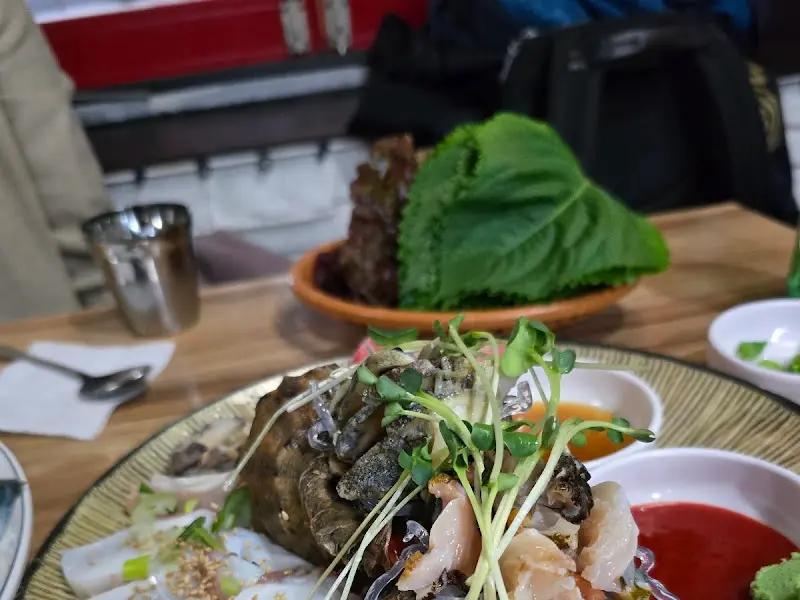 가게 문을 열자, 후각을 자극하는 짭짤한 바다 내음이 물씬 풍겼다. 테이블은 이미 손님들로 가득 차 있었고, 활기 넘치는 분위기가 느껴졌다. 나무 테이블 위에는 기본 찬들이 정갈하게 놓여 있었다. 쌈 채소와 곁들임 야채, 그리고 특제 막장이 눈에 띄었다. 특히, 고소한 참기름 향이 은은하게 풍기는 미나리 무침은 그 자체만으로도 훌륭한 술안주가 될 것 같았다.