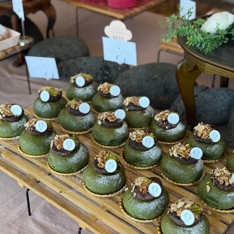 일단 빵부터 골라야지! 쟁반이랑 집게 딱 들고 빵 코너로 직진했는데, 눈이 핑글핑글 @.@ 진짜 종류가 어마어마하게 많다. 몽블랑 데니쉬, 맘모스 데니쉬, 소금빵, 크로와상… 다 먹고 싶어서 혼났네. 특히 시선을 강탈하는 건, 제주 특산물을 이용한 빵들! 쑥, 고구마, 한라봉… 이름만 들어도 벌써 맛있잖아. 결정장애 제대로 와서 한참을 서성이며 고민했다.