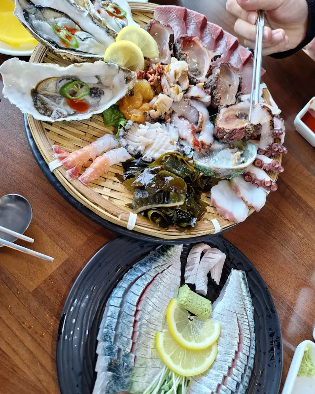 잠시 후, 드디어 기다리고 기다리던 음식이 나왔다. 화려한 비주얼에 입이 떡 벌어졌다. 신선한 해산물이 가득 담긴 모듬과 윤기가 흐르는 고등어회는 보기만 해도 군침이 돌았다. 멍게, 전복, 딱새우, 뿔소라, 돌문어숙회, 석화, 방어 등 다양한 해산물을 한 번에 맛볼 수 있다는 점이 특히 마음에 들었다.