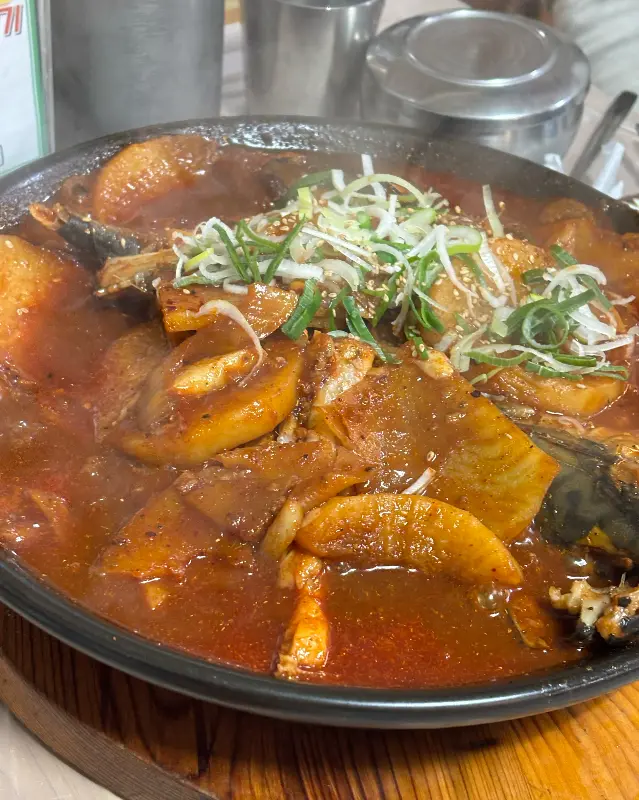 드디어 기다리고 기다리던 메인 메뉴, 바다풍경조림이 등장했다. 붉은 양념에 윤기가 자르르 흐르는 갈치조림의 모습은, 보는 것만으로도 침샘을 자극했다. 큼지막한 갈치와 고등어, 그리고 큼직하게 썰린 무와 감자가 푸짐하게 담겨 있었다. 특히 조림 위에는 신선한 파와 깨가 듬뿍 뿌려져 있어, 먹음직스러운 비주얼을 더욱 돋보이게 했다.