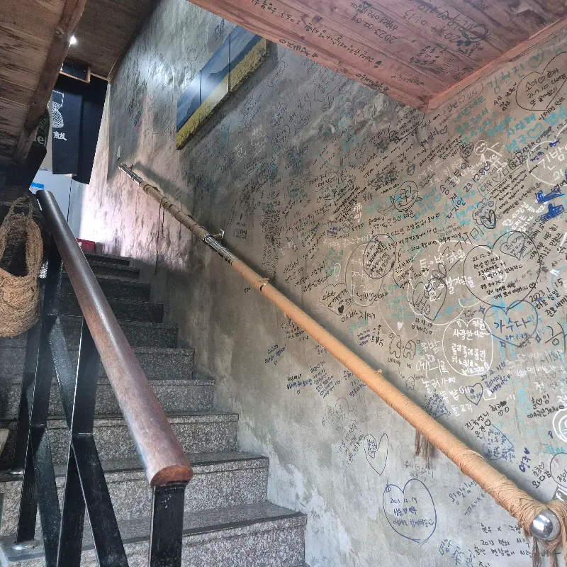 2층으로 향하는 계단, 벽면에 빼곡한 방문객들의 흔적이 인상적이다.