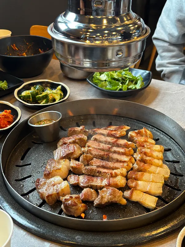 잘 달궈진 불판 위에 고기를 올리니, 치익- 하는 소리와 함께 훈연 향이 코를 찔렀어. 아이고, 이 냄새만 맡아도 침이 꼴깍 넘어가는구먼! 직원분께서 능숙한 솜씨로 고기를 구워주시는데, 어찌나 꼼꼼하시던지. 덕분에 우리는 편하게 앉아서 익어가는 고기를 구경만 하면 됐지. 노릇노릇하게 익어가는 고기를 보니, 얼른 입에 넣고 싶은 마음뿐이었어.