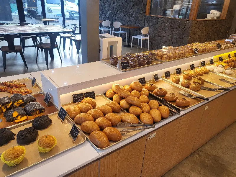 매장은 생각보다 훨씬 넓고 쾌적했다. 나무 테이블과 의자는 편안함을 더했고, 은은한 조명은 아늑한 분위기를 자아냈다. 통유리창 너머로는 쇠소깍의 아름다운 풍경이 펼쳐져, 빵과 커피를 즐기기에 더할 나위 없이 좋은 공간이었다. 에서 보듯, 진열대에는 다양한 빵들이 가지런히 놓여 있었다. 윤기가 흐르는 소금빵부터, 먹음직스러운 타르트, 겹겹이 살아있는 패스츄리까지, 눈을 어디에 둬야 할지 모를 정도로 화려했다. 마치 보석을 진열해 놓은 듯한 모습에 감탄사가 절로 나왔다.