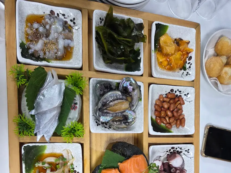 자, 이제부터가 진짜 시작이었어요. 쟁반 가득, 아니 쟁반으로는 부족해서 상 위에 빈틈없이 차려진 어마무시한 에피타이저 세트! 9개의 작은 접시에 형형색색의 해산물이 담겨 나오는데, 눈이 휘둥그레질 정도였답니다. 싱싱한 해산물들이 어찌나 예쁘게 담겨 있는지, 마치 예술 작품을 보는 듯한 기분마저 들었어요.