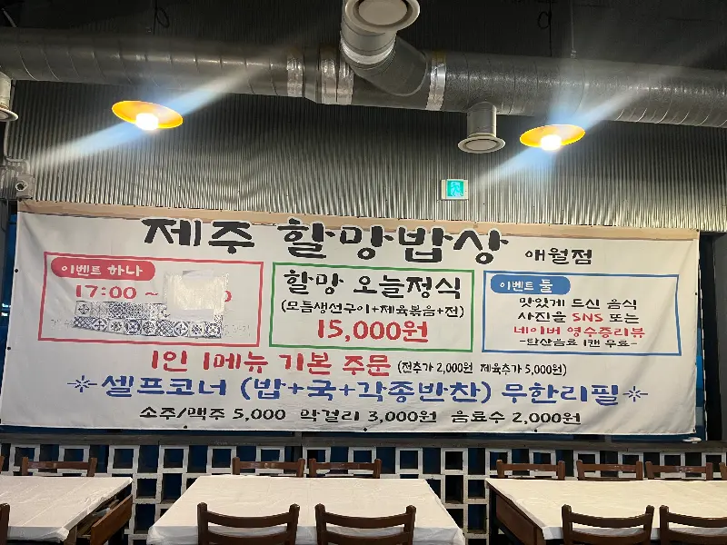 제주할망밥상 애월점의 메뉴와 가격 정보가 담긴 현수막 사진
