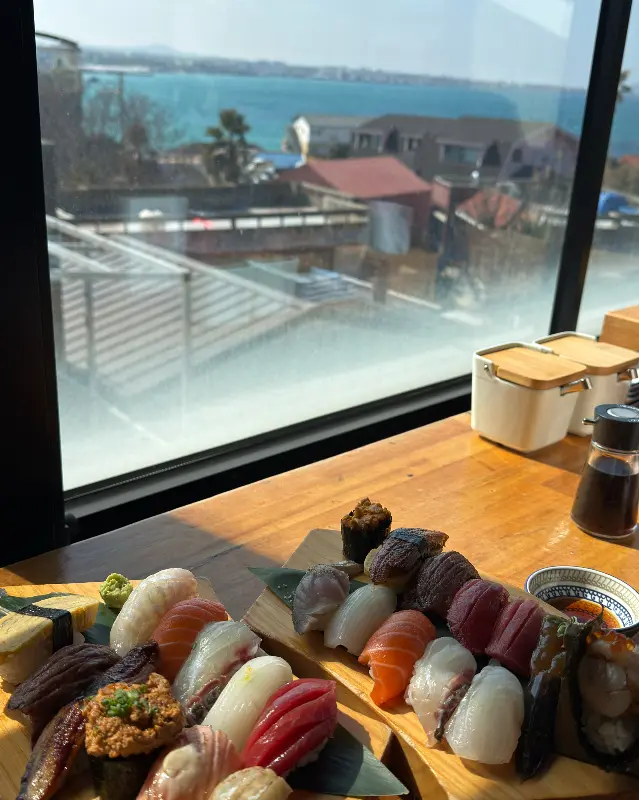 애월 바다를 배경으로 펼쳐지는 맛있는 초밥 한 상