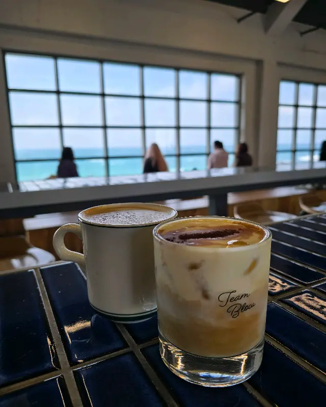 * 팀 라떼 (8,000원): 팀블로우의 시그니처 메뉴인 팀 라떼는 100% 사탕수수당이 첨가된 달콤한 라떼다. 부드러운 우유와 에스프레소의 조화, 그리고 은은하게 퍼지는 사탕수수당의 달콤함이 일품이다. 한 모금 마시는 순간, 마치 제주의 푸른 바다를 마시는 듯한 청량감을 느낄 수 있었다. 에는 창밖의 푸른 바다를 배경으로 놓인 팀 라떼의 모습이 담겨 있는데, 그 비주얼만큼이나 맛 또한 훌륭했다.