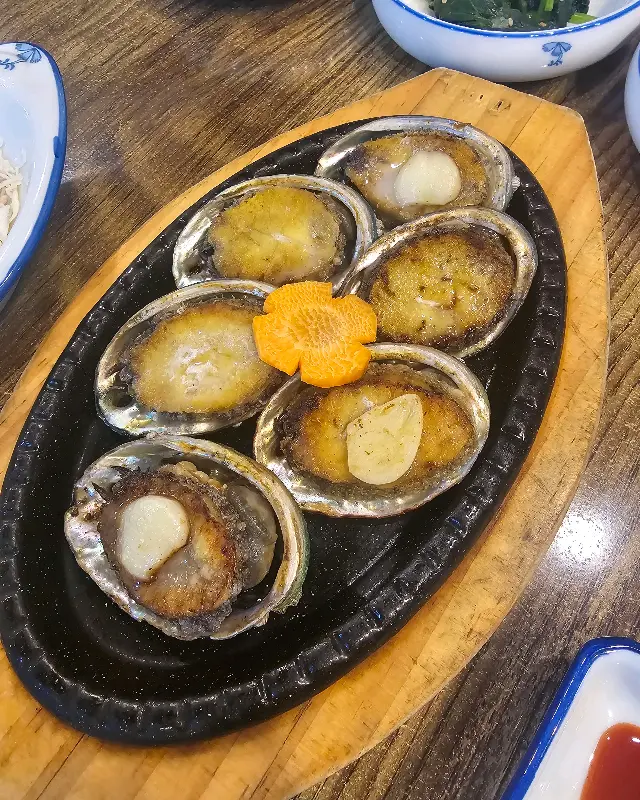 마지막으로 전복구이. 버터 향을 입은 전복이 뜨거운 철판 위에서 지글거리는 소리를 내며 등장했다. 직원분께서 먹기 좋게 손질해주셔서 편안하게 맛볼 수 있었다. 부드럽고 쫄깃한 전복을 한 입 베어 무니, 입안 가득 퍼지는 버터의 풍미와 전복 특유의 감칠맛이 환상적인 조화를 이루었다. 에서 보았던 것처럼, 해물라면에는 신선한 해산물이 아낌없이 들어가 있었다. 특히 와 는 전복구이의 윤기 흐르는 비주얼을 생생하게 담아내고 있다.