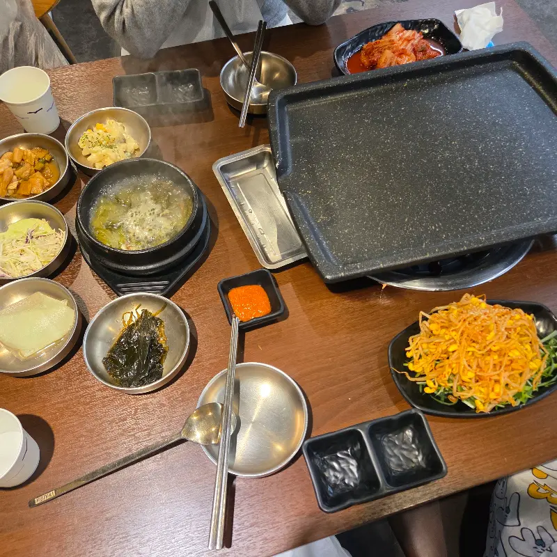 직원분들은 능숙한 솜씨로 흑돼지와 해산물을 불판 위에 올려 구워주셨다. 흑돼지가 160도 이상의 온도에서 마이야르 반응을 일으키며 표면에 갈색 크러스트가 형성되기 시작했다. 이 과정에서 흑돼지 특유의 고소한 향이 코를 자극하며 식욕을 더욱 증폭시켰다. 동시에, 해산물에서는 시원한 바다 향이 은은하게 퍼져 나왔다. 마치 향기로운 연기가 코를 간지럽히는 듯했다.