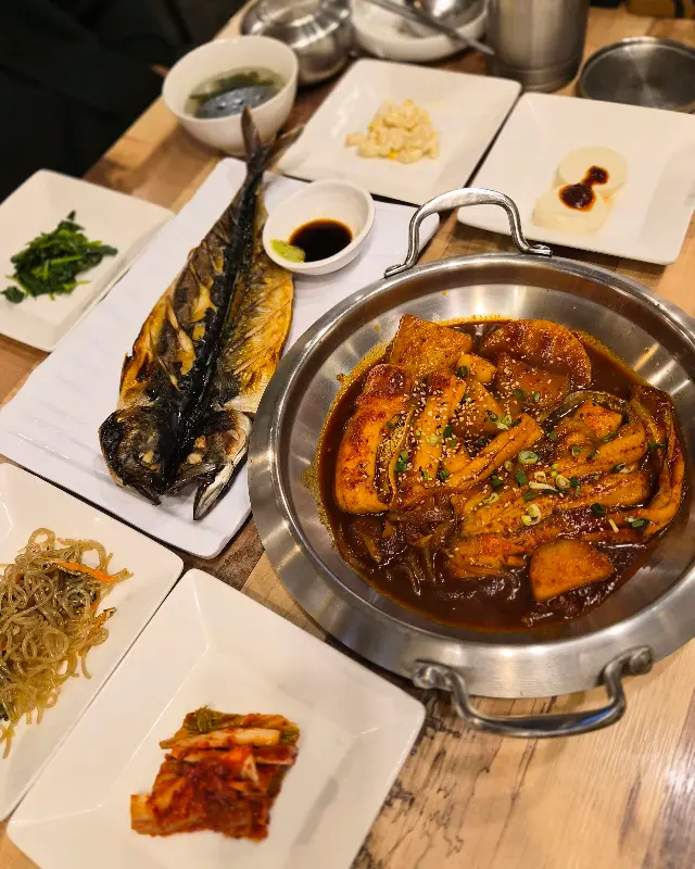 기다리고 기다리던 갈치조림 등장! 커다란 냄비에 빨간 양념이 듬뿍 들어간 갈치조림 비주얼, 진짜 대박이었어. 뼈 없는 순살 갈치라서 먹기도 얼마나 편한지! 양념이 진짜 예술인데, 너무 맵지도 않고, 너무 달지도 않고, 딱 적당하게 매콤달콤한 게, 밥도둑이 따로 없더라. 밥에 쓱쓱 비벼서 갈치 살 올려 먹으면, 진짜 천국이 눈앞에 펼쳐지는 기분! 특히 떡이 들어있는게 특이했는데, 쫄깃쫄깃하니 진짜 맛있었어.