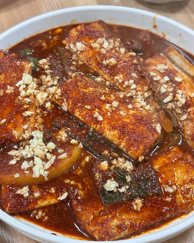 갈치조림이 테이블에 놓이는 순간, 매콤하면서도 달콤한 향이 코를 자극했습니다. 뚜껑을 여니 큼지막한 갈치 토막들이 붉은 양념에 푹 잠겨 있었고, 그 위에는 다진 마늘이 듬뿍 뿌려져 있었죠. 첫 입을 먹는 순간, 입 안 가득 퍼지는 마늘의 향긋함과 매콤한 양념의 조화가 정말 훌륭했습니다. 갈치는 어찌나 부드러운지, 뼈를 발라내는 것조차 어렵지 않았습니다. 특히 양념이 밥에 스며들어 밥도둑이 따로 없더군요. 사진에서 보이는 것처럼 갈치 살 위에 듬뿍 올려진 다진 마늘은 이 집만의 비법인 듯했습니다. 흔히 생선조림에서 느껴질 수 있는 비린 맛을 완벽하게 잡아주면서, 알싸한 풍미를 더해줘 젓가락을 멈출 수 없게 만들었습니다. 이건 정말 꼭 먹어봐야 해요!