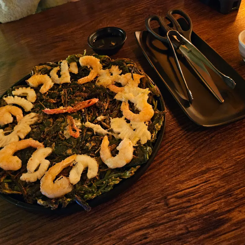 해물방아전은 시각적으로도 훌륭했다. 짙은 녹색의 방아잎 위에 새우와 오징어 등의 해물이 흩뿌려져 있었고, 가장자리 부분은 노릇하게 구워져 바삭한 식감을 예고하는 듯했다. 전을 한 입 크기로 잘라 입에 넣는 순간, 감탄사가 절로 나왔다. 겉은 바삭하고 속은 촉촉한, 완벽한 식감의 조화였다. 방아 특유의 향긋함은 해물의 비린 맛을 잡아주고, 감칠맛을 더욱 끌어올렸다.