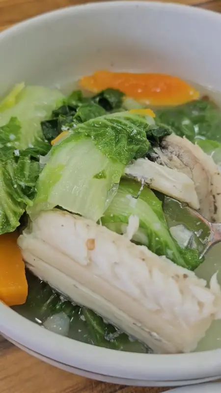갈치국에 들어간 채소들은 하나하나 신선함이 느껴졌다. 사진을 보면 알 수 있듯이, 배추의 푸른 잎과 당근의 선명한 주황색이 신선함을 그대로 보여준다. 특히, 푹 익은 무는 달콤하면서도 시원한 맛을 더해, 국물의 풍미를 더욱 깊게 만들었다. 슴슴한 듯하면서도 깊은 맛을 내는 국물은, 인위적인 조미료 맛이 전혀 느껴지지 않아 더욱 좋았다.