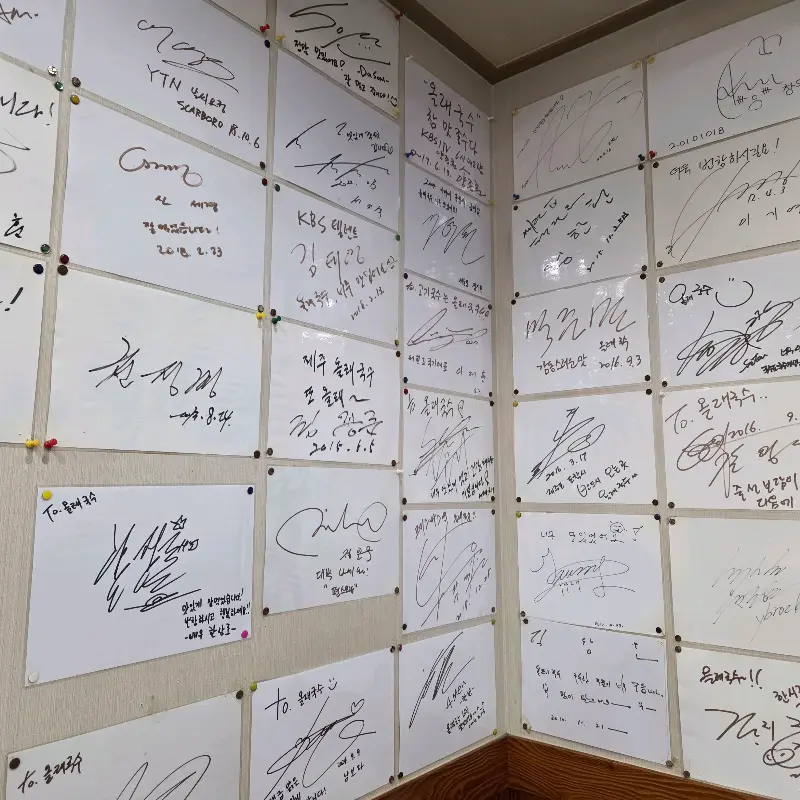 기다리는 동안, 가게 안에서 풍겨져 나오는 따뜻한 국물 냄새가 코를 자극했다. 멸치 육수와 돼지 육수가 조화롭게 어우러진 듯한 향긋한 냄새였다. 드디어 내 차례가 되어 안으로 들어서니, 생각보다 아담한 공간이 눈에 들어왔다. 테이블 간 간격은 좁았지만, 오히려 정겨운 분위기가 느껴졌다. 벽면에는 수많은 유명인들의 사인이 빼곡하게 붙어 있었다. 그들의 흔적을 살펴보는 재미도 쏠쏠했다. 마치 오랜 역사를 지닌 노포에 온 듯한 기분이었다.
