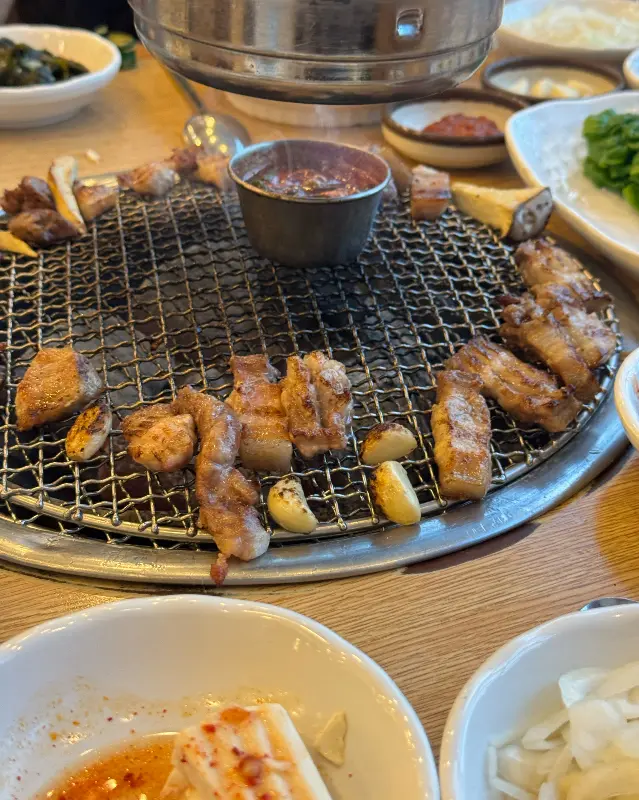 드디어 숯불이 들어오고, 기다리고 기다리던 흑돼지 삼겹살이 모습을 드러냈다. 선홍빛 살코기와 촘촘하게 박힌 지방의 조화가 보기만 해도 군침을 돌게 했다. 불판 위에 삼겹살을 올리자, 지글거리는 소리와 함께 고소한 냄새가 코를 자극했다. 숯불의 화력이 좋아서 금세 겉면이 노릇하게 익어갔다. 겉은 바삭하고 속은 촉촉하게 익은 흑돼지 삼겹살 한 점을 멜젓에 푹 찍어 입안으로 가져갔다.
