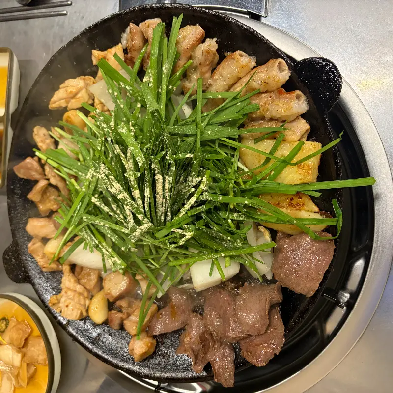 드디어 곱창모듬구이 등장! 비주얼부터가 완전 🔥불타오르네🔥. 곱이 꽉 찬 곱창에 윤기 좔좔 흐르는 대창, 쫄깃해 보이는 막창, 신선한 염통까지… 종류별로 옹기종기 모여있는 모습이 아주 그냥 예술이야. 특히 가운데 듬뿍 올려진 부추와 양파, 마늘의 조화, 이건 뭐 맛이 없을 수가 없는 조합이지. 사진을 얼마나 찍어댔는지 몰라. 인스타 업로드 각!