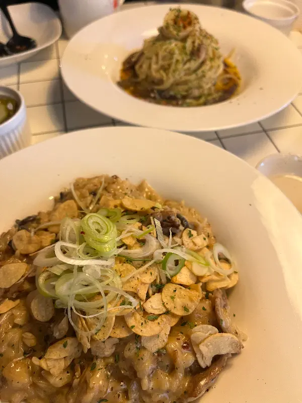 테이블 위에 놓인 보말 파스타와 불고기 크림 리조또